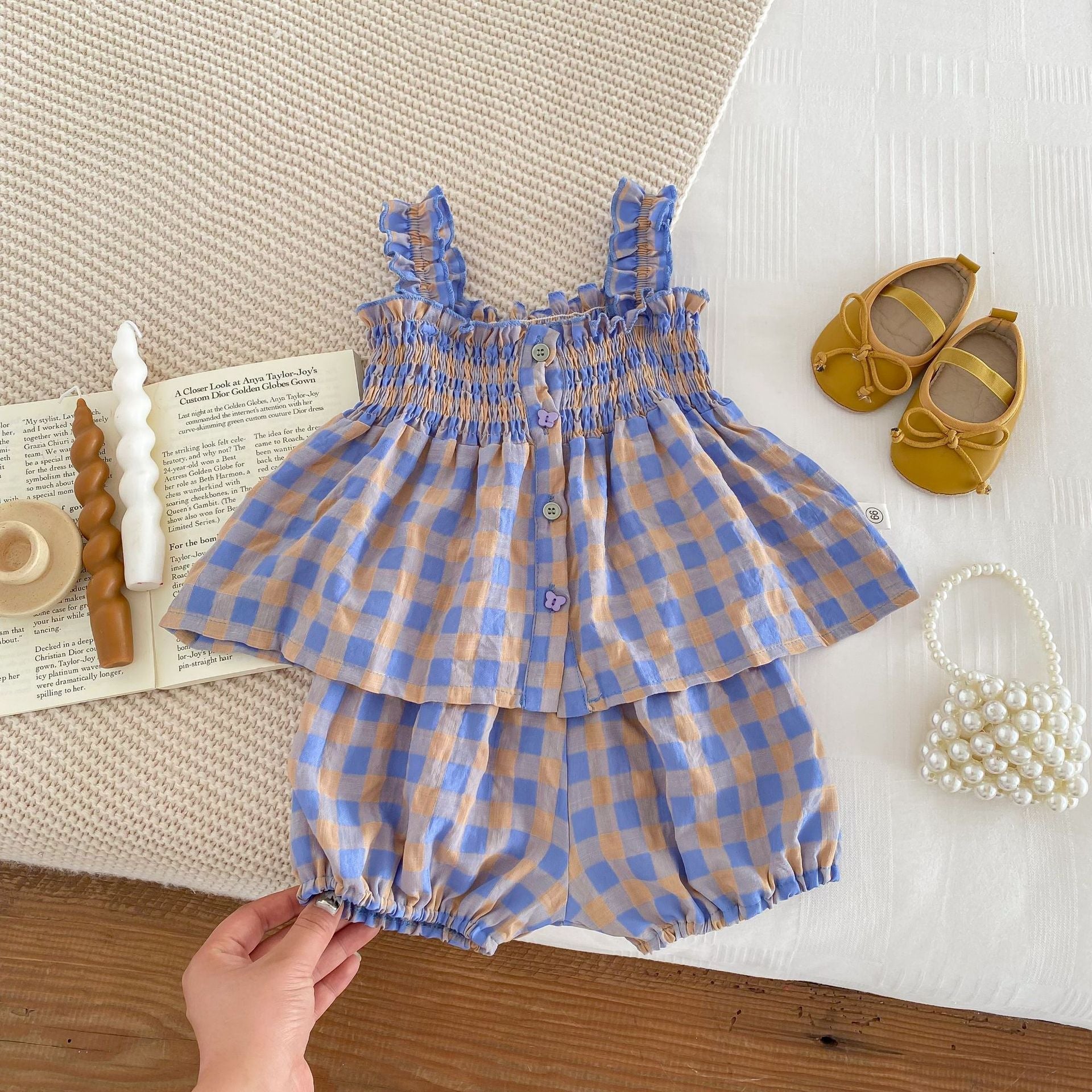 Summer Baby Kids Girls Plaid Strap Dress And Shorts Clothing Set